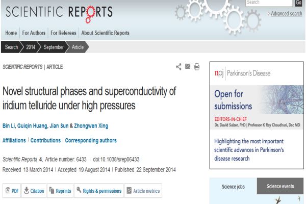 Bin Li, Guiqin Huang, Jian Sun & Zhongwen Xing. Novel structural phases and superconductivity of iridium telluride under high pressures. Scientific Reports, 2014, 4, Article number: 6433, doi:10.1038/srep06433