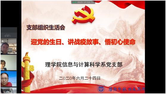 为迎接中国共产党建党99周年,为贯彻落实党中央关于常态化疫情防控的决策部署,充分发挥学校基层党组织战斗堡垒作用和师生党员先锋模范作用,让党旗始终高高飘扬在疫情防控、返校复学、事业发展全过程全方位,进一步深化“不忘初心、牢记使命”主题教育成效,信息与计算科学系党支部6月24日下午在腾讯会议召开“迎党的生日、讲战疫故事、悟初心使命”专题组织生活会。会议由党支部书记戴建新主持,437bwin必赢国际官网党委书记尹志丽和信息与计算科学系全体党员同志参加了组织生活会。