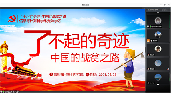 2月26日下午信息与计算科学系党支部全体党员教师在腾讯会议上集中学习了习近平总书记在全国脱贫攻坚总结表彰大会上的重要讲话。本次活动由支部书记戴建新召集,由该支部严珍珍老师轮值主持分享学习心得和体会。副院长金正猛教授以普通党员身份参加了党课学习。