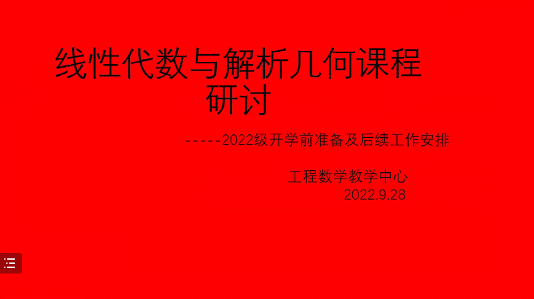2022年9月22日下午14:00点和晚上20:00,工程数学教学中心召开线上教学研讨例会,会议由中心副主任叶军主持,本学期线性代数课程全体任课教师和中心所有教师分别参加了相关会议。