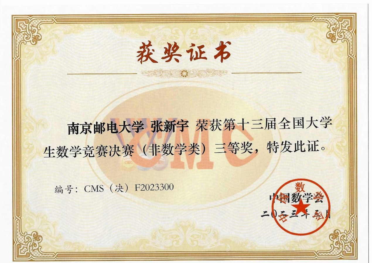 第十三届全国大学生数学竞赛(江苏赛区)于2021年11月举办,一个月后成绩揭晓。高等数学竞赛教练组得知张新宇进入决赛,立即开展有针对性地辅导和培训,线上、线下答疑,全程跟踪指导。因决赛延期举办,原参赛计划被打乱。张新宇在这一年多的备赛时间中,除了认真完成学业(绩点与综测均为专业第一)之外,同时参加了其它赛事和暑期夏令营,顶住了升学和写论文等多重压力,在437bwin必赢国际官网高数竞赛教练组的全力支持和精心指导下,进行了短期冲刺备赛,不仅取得了此次决赛三等奖的好成绩,还顺利保研到浙江大学。