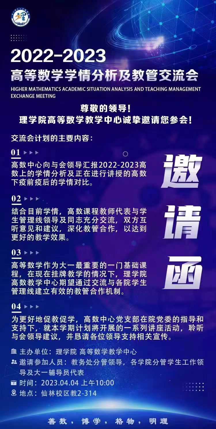 为进一步提升高等数学课程的教学质量,2023年4月4日上午10:00在437bwin必赢国际官网教2-314会议室,高等数学教学中心在教务处和437bwin必赢国际官网党委指导和支持下,首次承办了高等数学学情分析和教管交流会,会议由中心主任蔡云峰主持,会议邀请了教务处副处长臧庆,各学院分管学工和教学的党委副书记、副院长及辅导员代表,高数中心课程组负责人及部分教师代表也参加了会议。