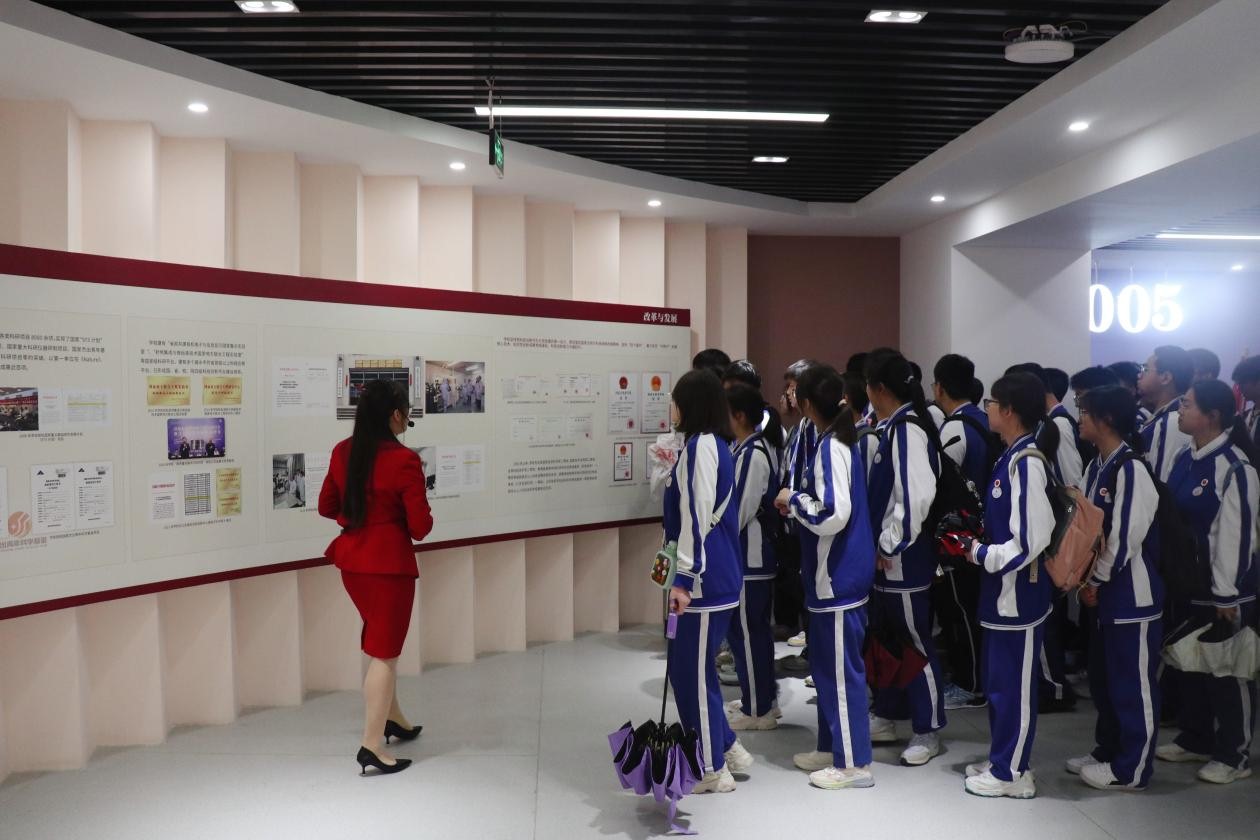 本次研学活动设置参观两馆、主题讲座、校园打卡等三个环节。在参观两馆环节,马相伯高级中学的学生们分组参观了校史馆以及通信展览馆。在校史馆,从山东战时邮务总局干训班到如今的国家“双一流”建设高校,在编年体与专题相结合的新型展示形式下,同学们深切地感受了南邮筚路蓝缕的奋斗历程。在通信展览馆,从电报通信、电话通信到6G通信、量子通信,在讲解员的带领下,同学们认真倾听了南邮通信发展历程中的大事,与台上陈列的通信设备近距离接触。