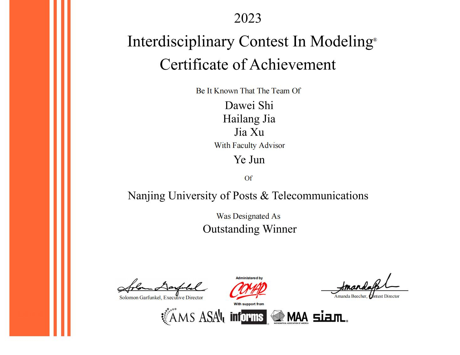 2023 年美国大学生数学建模竞赛和跨学科建模竞赛结果今日公布,全球有21858 个队参加了本届竞赛,共评出特等奖(Outstanding Winner)37 项,我校金栩老师和叶军老师指导的队各获 1 项特等奖(Outstanding Winner),闫冬雪老师指导的队获 AMS Award(美国数学学会奖),这是我校首次同时获得两个特等奖(Outstanding Winner)及首次获得 AMS Award(美国数学学会奖),竞赛成绩取得新的突破,我校获特等奖数量并列(与上海交通大学、天津大学)全国第四名,位列江苏省第一名(江苏高校一共获得三个特等奖)。另外,我校学生还获得特等奖提名奖(Finalist)15 项、一等奖(Meritorious Winner)44 项、二等奖(Honorable Mention)109 项,各奖项的获奖数量均创历史新高。