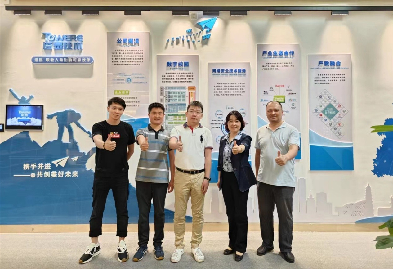 招生组一行随后还来到我校05级校友颜靖、罗茂云合伙创办的高新技术企业广西塔易信息技术有限公司。该公司是一家以“教育+IT”综合服务为核心业务的创新型企业,已成为国家高新技术企业和广西壮族自治区产教融合试点企业。从塔易科技蓬勃向上、富有活力的经营理念和企业文化中,我们也深刻感受到了学校“无创新不南邮”的人才培养理念。两位校友也表示,希望学校能一如既往培养更多电子信息领域的优秀人才,也特别欢迎母校广西籍的优秀毕业生加入塔易科级,为家乡的高新技术行业和数字经济发展贡献南邮力量。