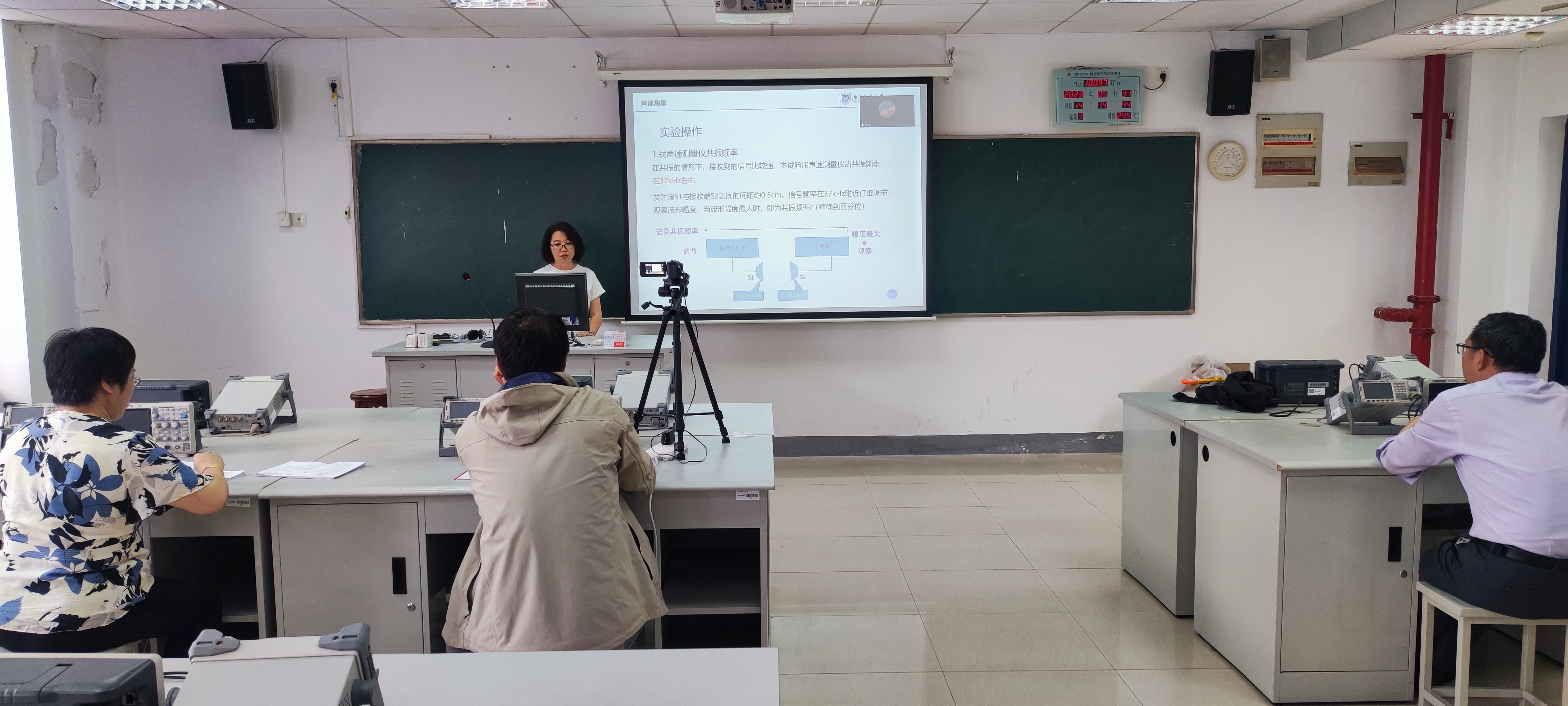 教学沙龙第6讲主讲教师为物理实验教学中心张博,从事大学物理实验教学20余年,讲授题目为“惠斯通电桥测电阻”,她从惠斯通电桥结构、工作原理、中值电阻测量方法、比率臂选择及电桥灵敏度探究等方面清晰地讲解了相关内容。教学沙龙第7讲主讲教师为物理实验教学中心董慧媛,从事大学物理及物理实验教学20年,讲授题目为“声速测量”,她从共振干涉法、相位比较法、驻波和振动合成理论、压电陶瓷换能器结构和功能、逐差法处理实验数据等方面上了一堂内容丰富的物理实验课。董老师在沙龙授课完毕后,与参会教师就《声速测量实验》教学中的一些疑难问题和学生在课堂中易犯的错误进行了充分的交流和讨论,达到了较好的教研研讨效果。