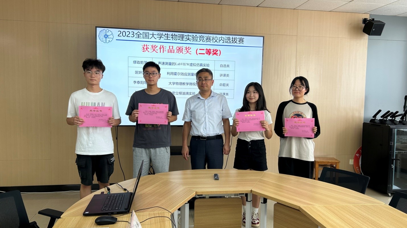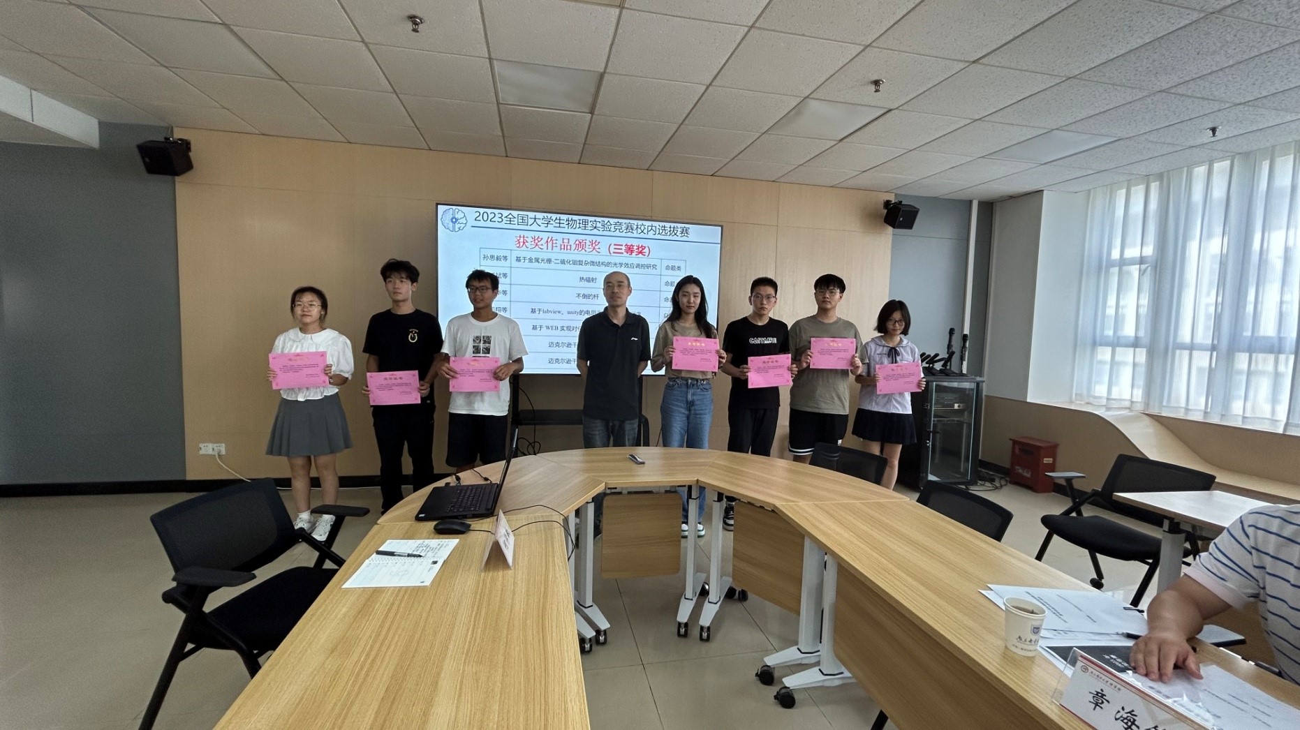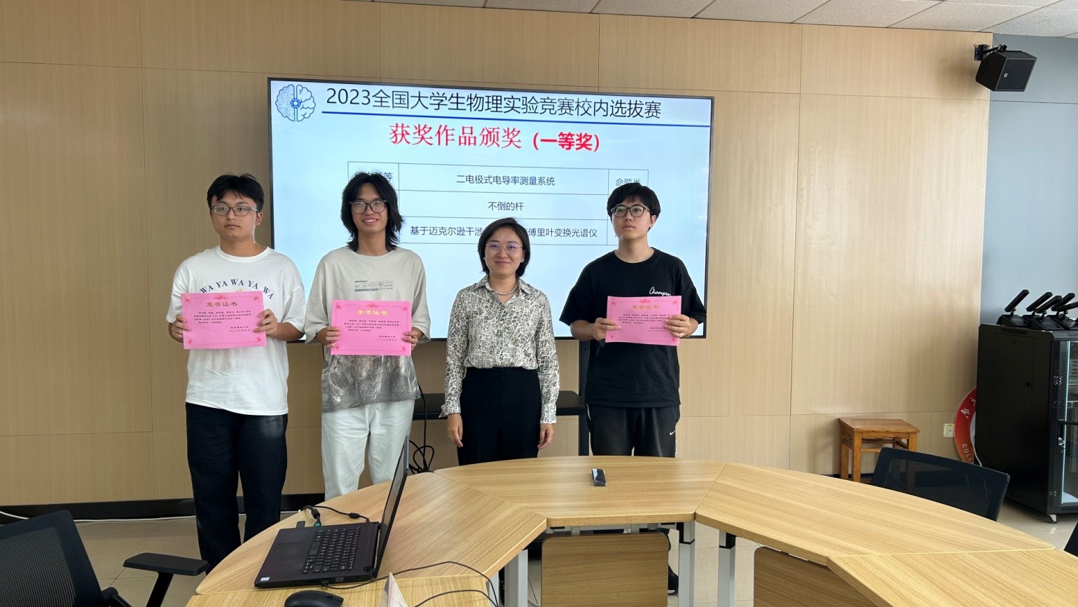 在研讨会第一阶段,何学敏简要介绍了2023全国大学生物理实验竞赛(创新)校内选拔赛的总体情况。据介绍,今年共有27支队伍合计99名学生参加校内选拔赛,来自学校13个二级学院中的24个专业,16位教师参与竞赛指导,竞赛覆盖面和影响力进一步扩大。在校赛评审过程中,将27项作品分为实物装置类、教学资源类和实验讲课类三大类别进行分类评审,每大类别都邀请校内外的四位专家评审打分,最终评定出一等奖3项、二等奖4项、三等奖7项,并择优推荐5项作品参加国赛。物理实验教学中心主任毛巍威、贺超凯科长和高丽副院长给获奖学生颁奖,对各个参赛队伍一个学期以来的努力进行了充分肯定。