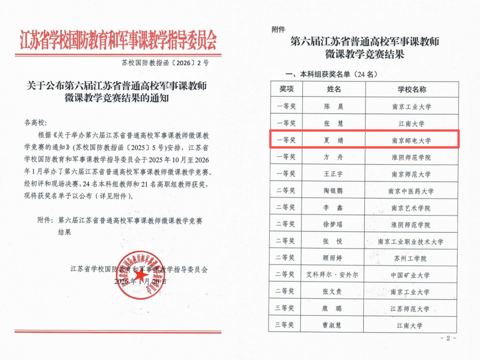 近日,第六届江苏省普通高校军事课教师微课教学竞赛决赛在南京落下帷幕。我院辅导员夏婧老师斩获一等奖,取得我校在该项赛事中的最好成绩。